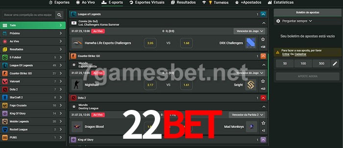 O 22bet oferece uma grande seleção de opções de apostas em e-sports com probabilidades competitivas